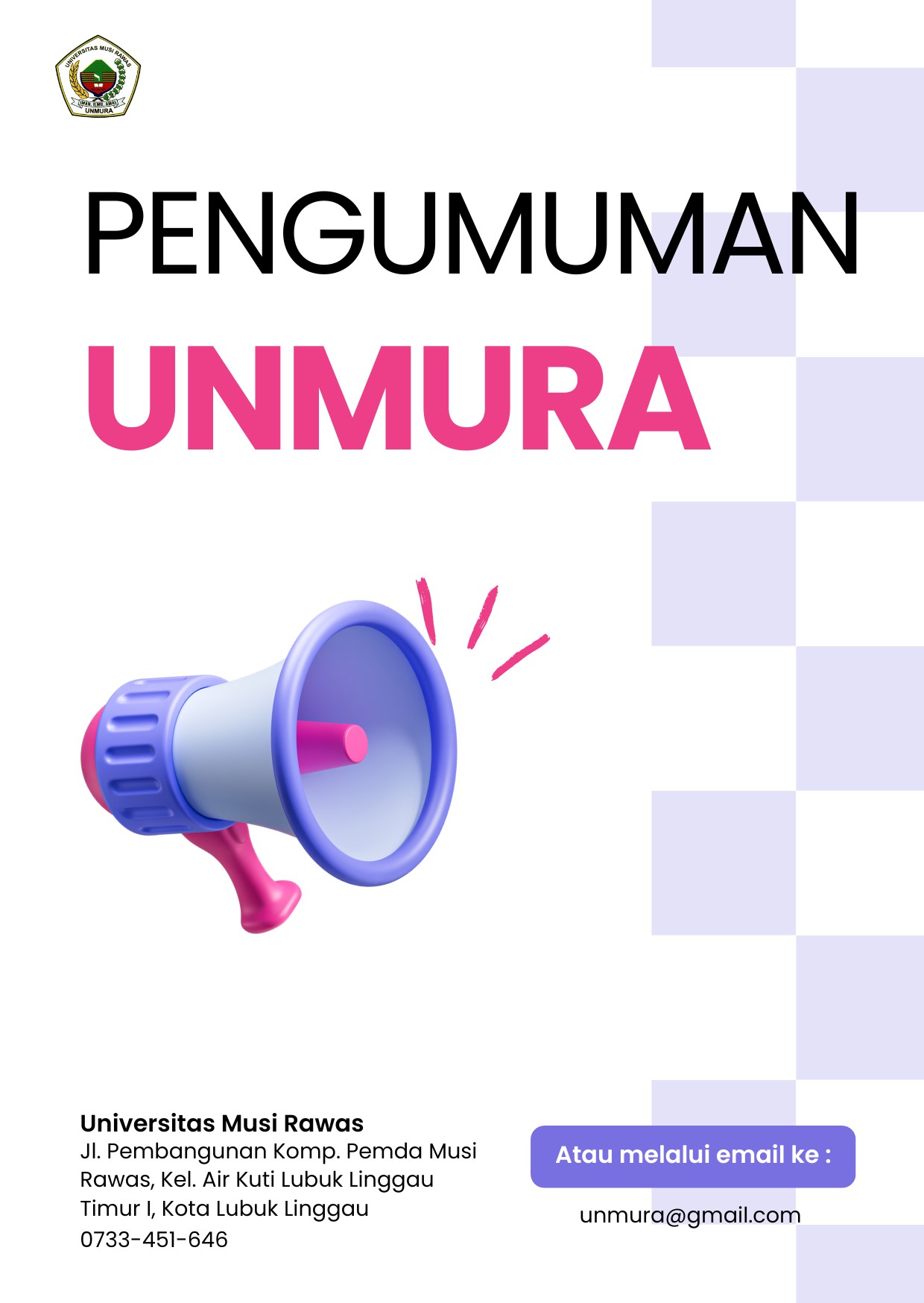 Puji dan syukur kita panjatkan ke hadirat Allah SWT, Tuhan Yang Maha Esa, karena atas rahmat dan karunia-Nya, Universitas Musi Rawas (UNMURA) terus tumbuh dan berkembang sebagai institusi pendidikan tinggi yang berkomitmen mencetak generasi unggul, berkarakter, dan berdaya saing global.